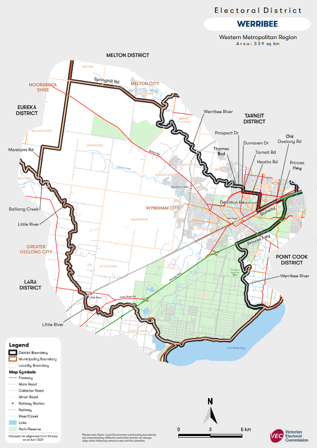 The electorate takes in the communities of Werribee, Wyndham Vale, Mambourin, Manor Lakes, Cocoroc, Quandong and Little River.